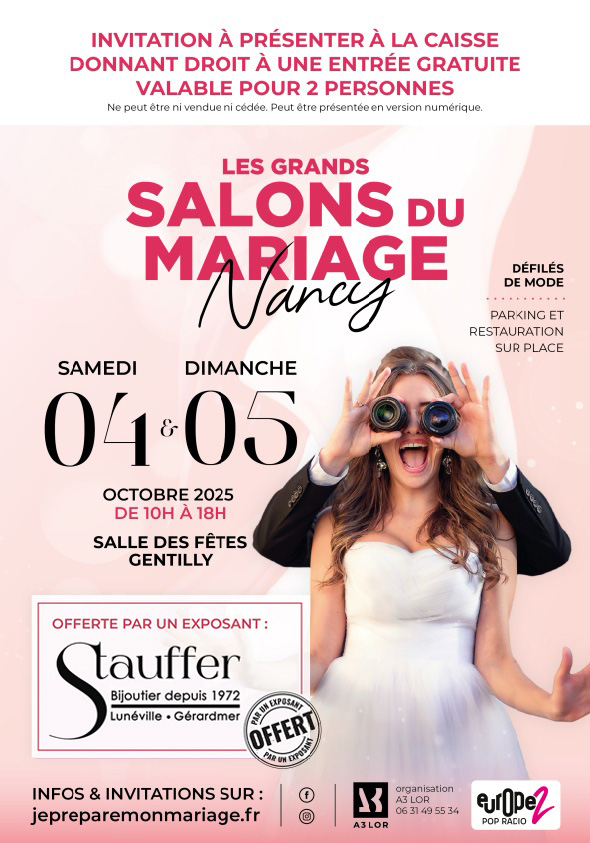 Les 4 et 5 octobre, le Salon du Mariage de Nancy rassemblera les univers du mariage sous un même toit : robes, costumes, photographes, décorateurs… et bien sûr, les artisans de l’amour éternel que sont les bijoutiers. Pour les visiteurs, ce sera l’occasion d’essayer, comparer, se laisser séduire et, peut-être, de trouver la pièce qui brillera à leur doigt toute une vie.